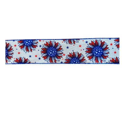 2.5 Inch Wired 4th of July, Red White Blue Sunflower Printed Ribbon (sold in 10 yard roll)