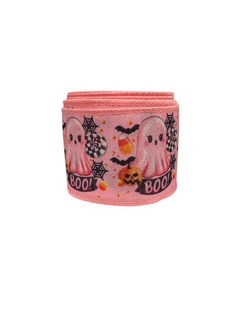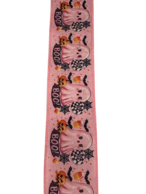 2.5 inch Wired Halloween Boo Candy Corn Print on Pink (sold in 10 yard roll)